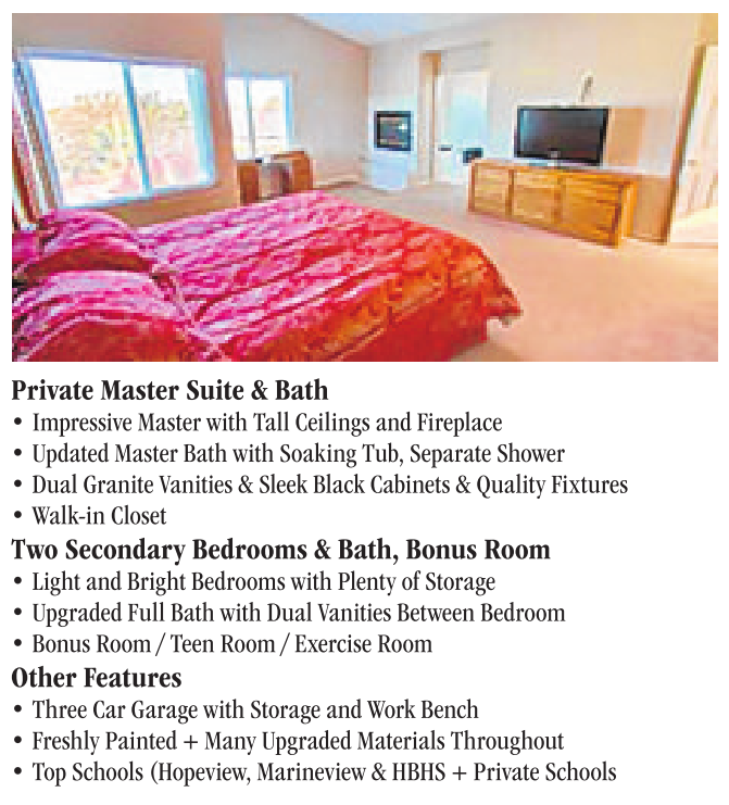 Private Master Suite & Bath • Impressive Master with Tall Ceilings andFireplace • Updated Master Bath with SoakingTub,SeparateShower • DualGranite Vanities &Sleek BlackCabinets&Quality Fixtures • Walk-inCloset Two Secondary Bedrooms & Bath, Bonus Room • Light andBrightBedrooms with Plenty of Storage • UpgradedFullBathwithDualVanitiesBetween Bedroom • Bonus Room /TeenRoom/ExerciseRoom Other Features • Three CarGaragewithStorage andWorkBench • Freshly Painted+ManyUpgradedMaterials Throughout • Top Schools(Hopeview,Marineview&HBHS +Private Schools