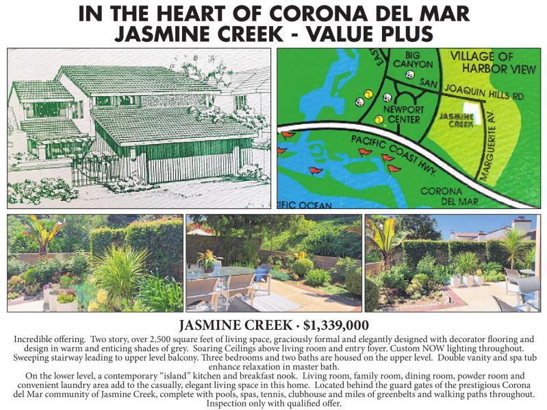 IN THE HEART OF CORONA DEL MAR JASMINE CREEK - VALUE PLUS JASMINE CREEK · $1,339,000 Incredible offering. Two story, over 2,500 square feet of living space, graciously formal and elegantly designed with decorator flooring and design in warm and enticing shades of grey. Soaring Ceilings above living room and entry foyer. Custom NOW lighting throughout. Sweeping stairway leading to upper level balcony. Three bedrooms and two baths are housed on the upper level. Double vanity and spa tub enhance relaxation in master bath. On the lower level, a contemporary “island” kitchen and breakfast nook. Living room, family room, dining room, powder room and convenient laundry area add to the casually, elegant living space in this home. Located behind the guard gates of the prestigious Corona del Mar community of Jasmine Creek, complete with pools, spas, tennis, clubhouse and miles of greenbelts and walking paths throughout. Inspection only with qualified offer.