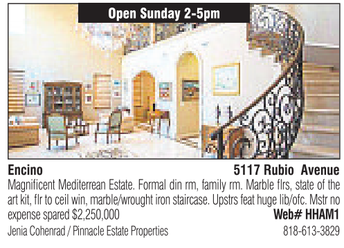 Open Sunday 2-5pm Encino 5117 Rubio Avenue Magnificent MediterreanEstate. Formaldin rm, family rm. Marbleflrs, state of the artkit, flr to ceil win, marble/wrought iron staircase. Upstrs feat hugelib/ofc. Mstr no expensespared $2,250,000 Web# HHAM1 JeniaCohenrad /PinnacleEstateProperties 818-613-3829 See also