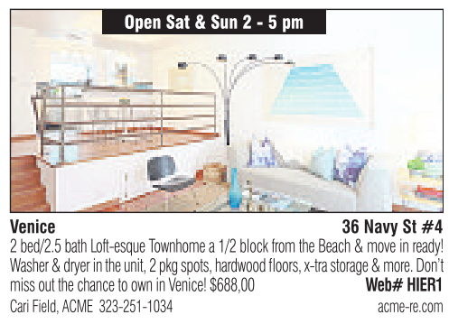 Venice 36 Navy St #4 2bed/2.5 bath Loft-esque Townhomea1/2 blockfromthe Beach&moveinready! Washer &dryer in the unit, 2pkg spots, hardwoodfloors, x-tra storage &more. Don’t miss outthe chancetoown in Venice! $688,00 Web# HIER1