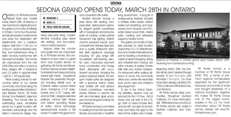 CA -TRI Pointe Homes debuts three new models today,March 28th, at Sedona,a new townhome neighborhood in the gated communityofParkside in Ontario. Come tourthe professionally decorated modelhomes and enjoy the celebration with refreshments and a children’s balloon artist from 11:00 a.m. to 3:00 p.m. Sedonafeatures carefree, low-maintenance living in stylish two-story townhomes with abundant amenities. The homes are value-priced from the mid $300,000s and offer a choice of three designs with 3 bedrooms and 2.5 baths in approximately 1,462 to 1,749 square feet.