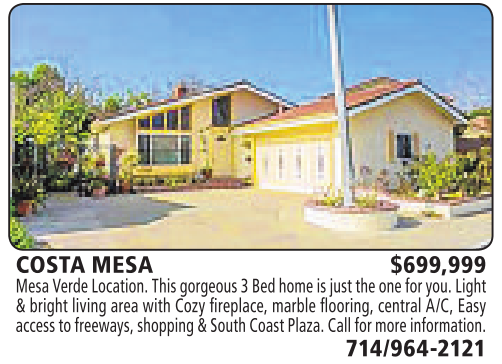 COSTA MESA $699,999 Mesa VerdeLocation. This gorgeous 3Bed homeisjust theone for you. Light &bright living area with Cozy fireplace, marble flooring, central A/C, Easy access to freeways, shopping &South CoastPlaza. Call formore information. 714/964-2121