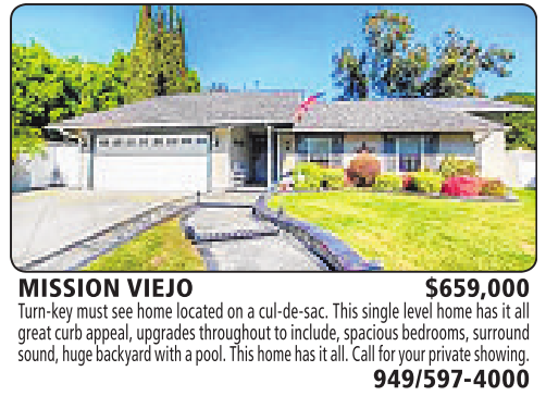 MISSION VIEJO $659,000 Turn-key must seehome locatedonacul-de-sac. This single levelhome hasitall great curb appeal,upgrades throughouttoinclude,spacious bedrooms, surround sound, huge backyard with apool. This home has it all. Call foryour private showing. 949/597-4000