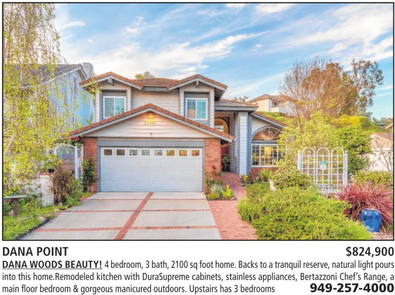 DANA POINT $824,900 DANA WOODS BEAUTY! 4bedroom,3bath, 2100 sq foot home.Backs to atranquil reserve, natural lightpours into this home.Remodeled kitchen with DuraSupreme cabinets, stainless appliances, Bertazzoni Chef’s Range, a mainfloorbedroom &gorgeous manicuredoutdoors.Upstairshas 3bedrooms 949-257-4000