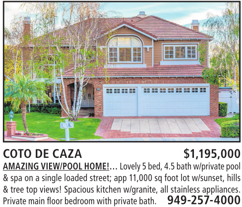 COTO DE CAZA $1,195,000 AMAZING VIEW/POOLHOME!… Lovely 5bed, 4.5bathw/private pool &spa on asingle loaded street; app 11,000 sq foot lot w/sunset, hills &tree top views! Spacious kitchen w/granite, all stainless appliances. Private main floorbedroom with privatebath. 949-257-4000
