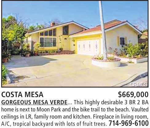 COSTA MESA $669,000 GORGEOUS MESA VERDE... This highly desirable 3BR2BA home is nexttoMoonParkand thebiketrail to thebeach.Vaulted ceilings in LR,family roomand kitchen. Fireplace in living room, A/C, tropical backyard with lots of fruittrees. 714-969-6100