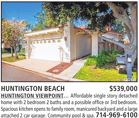 HUNTINGTON BEACH $539,000 HUNTINGTON VIEWPOINT… Affordable single story detached home with 2bedroom2bathsand apossible officeor3rd bedroom. Spacious kitchen openstofamily room,manicured backyard and alarge attached 2car garage. Community pool&spa.714-969-6100