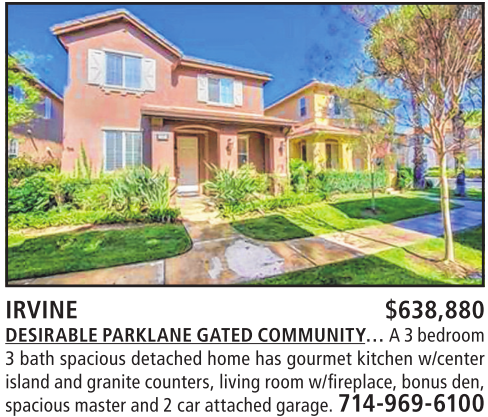 3bath spacious detached home has gourmet kitchen w/center island andgranitecounters, living room w/fireplace,bonus den, spaciousmaster and2carattached garage. 714-969-6100