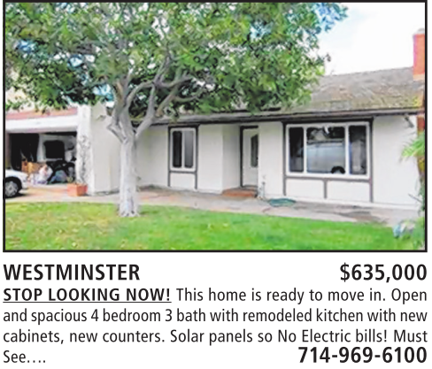 andspacious 4bedroom3bath with remodeledkitchen with new cabinets, new counters. Solar panels so No Electric bills! Must See…. 714-969-6100