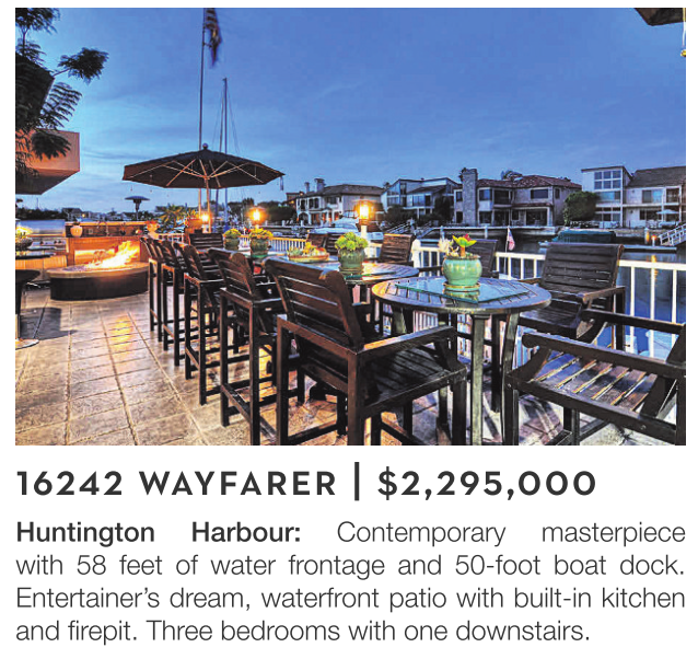 Huntington Harbour: Contemporary masterpiece with 58 feet of water frontage and 50-foot boat dock. Entertainer’s dream, waterfront patio with built-in kitchen and firepit. Three bedrooms with one downstairs.