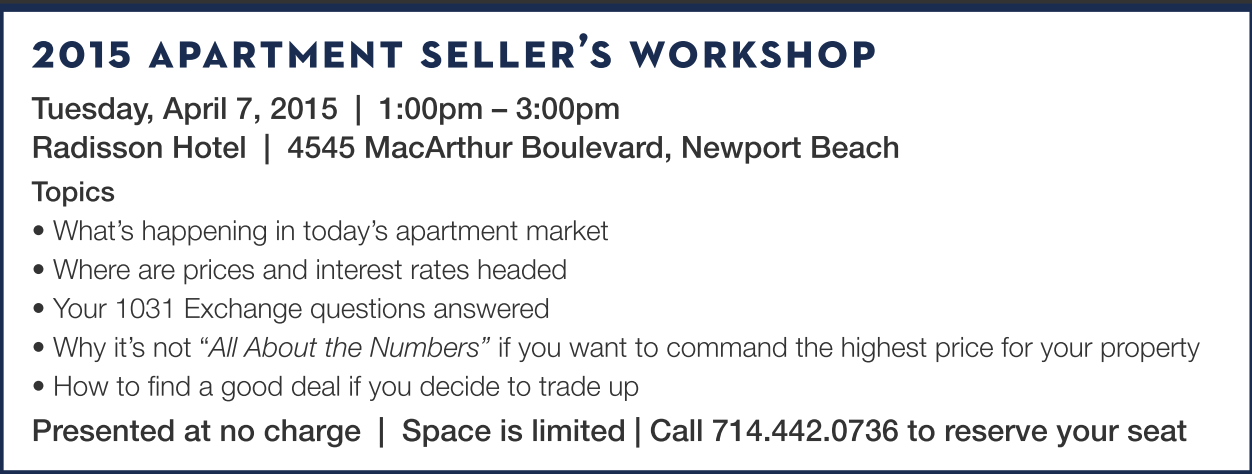 2015 APARTMENT SELLER’S WORKSHOP Tuesday, April 7, 2015 | 1:00pm – 3:00pm Radisson Hotel | 4545 MacArthur Boulevard, Newport Beach Topics Topics • What’s happening in today’s apartment market • What’s happening in today’s apartment market • Where are prices and interest rates headed • Where are prices and interest rates headed • Your 1031 Exchange questions answered • Your 1031 Exchange questions answered • Why it’s not “All About the Numbers” if you want • Why it’s not “All About the Numbers” if you want to command to command the the highest highest price pricefor foryour property • How to find a good deal if you decide to trade up • How to find a good deal if you decide to trade up Presented at no charge | Space is limited Presented at no charge | Space is limited | Call 714.442.0736 to reserve your seat Call 714.442.0736 to reserve your seat