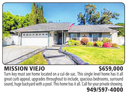 MISSION VIEJO $659,000 Turn-key must seehome locatedonacul-de-sac. This single level home hasitall great curb appeal,upgrades throughouttoinclude,spacious bedrooms,surround sound, huge backyard with apool. This home has it all. Call foryour private showing.