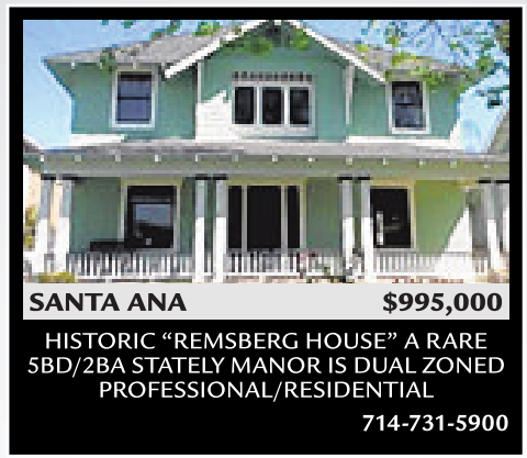 HISTORIC “REMSBERGHOUSE” ARARE 5BD/2BA STATELY MANOR ISDUALZONED PROFESSIONAL/RESIDENTIAL 714-731-5900
