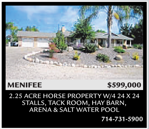 2.25 ACRE HORSEPROPERTY W/424X 24 STALLS,TACK ROOM, HAY BARN, ARENA &SALT WATER POOL 714-731-5900