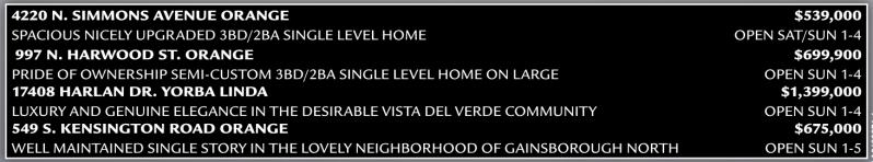 4220 N. SIMMONS AVENUE ORANGE $539,000 SPACIOUS NICELY UPGRADED 3BD/2BA SINGLE LEVEL HOME OPEN SAT/SUN 1-4 997 N. HARWOOD ST. ORANGE $699,900 PRIDE OF OWNERSHIP SEMI-CUSTOM 3BD/2BA SINGLE LEVEL HOME ON LARGE OPEN SUN 1-4 17408 HARLAN DR. YORBA LINDA $1,399,000 LUXURY AND GENUINE ELEGANCE IN THE DESIRABLE VISTA DEL VERDE COMMUNITY OPEN SUN 1-4 549 S. KENSINGTON ROAD ORANGE $675,000 WELL MAINTAINED SINGLE STORY IN THE LOVELY NEIGHBORHOOD OF GAINSBOROUGH NORTH OPEN SUN 1-5
