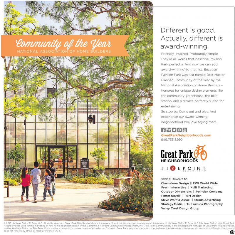 © 2013 Heritage Fields El Toro, LLC. All rights reserved. Great Park Neighborhoods is a trademark of and the bicycle logo is a registered trademark of Heritage Fields El Toro, LLC (Heritage Fields) dba Great Park Neighborhoods used for the marketing of new home neighborhoods in Irvine, California. Five Point Communities Management, Inc. (Five Point Communities) is the development manager of Great Park Neighborhoods. Neither Heritage Fields nor Five Point Communities is designing, constructing or offering homes for sale in Great Park Neighborhoods. All proposed amenities are subject tochange without notice. Lifestyle photography does not reflect any ethnic or racial preference. (4/15)