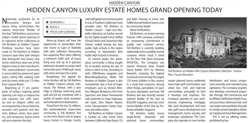 acclaimed for its innovative designs and luxury living communities, the nation’s three-time “Builder of the Year,”Toll Brothers,announces today’s model grand opening of its signature home collections at Toll Brothers at Hidden Canyon. Finishing touches have been made to Toll Brothers at Hidden Canyon’s open floor plan designs that distinguish two luxury new home collections atopone of the highest vistas on the Irvine Ranch. This unprecedented community is surrounded by preservedopen space, rolling hills, walking trails and cityviews, while just 7.5 miles from Laguna Beach.