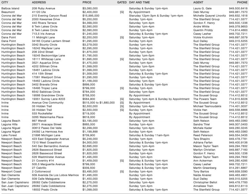 Balboa Island 208 Ruby Avenue $3,080,000 Saturday & Sunday 1pm-4pm Laura G. Gale 949.500.6418 Beaumont 41120 Ute $2,400,000 [G] By Appointment Debi Murray 949.981.7570 Corona del Mar 215 Evening Canyon Road $15,995,000 Staruday 12pm-3pm & Sunday 1pm-4pm Michelle Queyrel Linovitz 949.632.1618 Corona del Mar 2000 Kewamee Drive $5,250,000 Sunday 1pm-4pm The Stanfield Group 714.421.3377 Corona del Mar 440 Rivera Terrace $4,399,000 Saturday 1pm-4pm Gordon F. Henry 949.500.1236 Corona del Mar 8 Twin Lakes Circle $2,390,000 Saturday 1pm-4pm Andre White 949.378.9653 Corona del Mar 8 Twin Lakes Circle $2,390,000 Sunday 1pm-4pm Quentin Priddy 714.814.4663 Corona del Mar 713.5 Iris Avenue $1,245,000 Saturday & Sunday 1pm-4pm Casey Lesher 949.702.7211 Dana Point 11 Midnight Lane $2,250,000 [G] Saturday 1pm-4pm Vickie Kruhmin 949.697.3579 Dana Point 34165 Crystal Lantern Street $1,295,000 Sunday 1pm-4pm Suzi Dailey 949.315.5255 Huntington Beach 3342 Bounty Circle $3,279,000 Sunday 1pm-4pm The Stanfield Group 714.421.3377 Huntington Beach 16242 Wayfarer Lane $2,295,000 Sunday 1pm-4pm The Stanfield Group 714.421.3377 Huntington Beach 206 22nd Street $1,875,000 Sunday 1pm-5pm The Stanfield Group 714.421.3377 Huntington Beach 19245 Beckonridge Lane $1,795,000 Saturday 1pm-5pm The Stanfield Group 714.421.3377 Huntington Beach 16111 Whitecap Lane $1,695,000 [G] Saturday 1pm-5pm The Stanfield Group 714.421.3377 Huntington Beach 3521 Aquarius Drive $1,475,000 Sunday 1pm-4pm Debi Murray 949.981.7570 Huntington Beach 4202 Silliman Drive $1,399,000 Saturday 1pm-5pm The Stanfield Group 714.421.3377 Huntington Beach 16461 Ladona Circle $1,399,000 Sunday 1pm-4pm The Stanfield Group 714.421.3377 Huntington Beach 414 15th Street $1,358,000 Saturday & Sunday 1pm-5pm The Stanfield Group 714.421.3377 Huntington Beach 17081 Westport Drive $1,295,000 Sunday 1pm-4pm The Stanfield Group 714.421.3377 Huntington Beach 16462 Ladona Circle $1,168,000 Saturday 1pm-5pm The Stanfield Group 714.421.3377 Huntington Beach 3452 Bravata Drive $899,000 Saturday & Sunday 1pm-5pm The Stanfield Group 714.421.3377 Huntington Beach 16495 Tropez Lane $799,000 [G] Sunday 1pm-4pm The Stanfield Group 714.421.3377 Huntington Beach 6542 Sabbicas Circle $784,000 Saturday 1pm-5pm The Stanfield Group 714.421.3377 Huntington Beach 19566 Grandview Circle $758,000 By Appointment The Soussé Group 714.412.8512 Huntington Beach 19351 Sunray Lane #203 $584,900 [G] Saturday 1pm-4pm & Sunday by Appointment The Powers Team 714.815.8226 Irvine Avenue One Community $515,000 to $1,680,000 [G] By Appointment The Soussé Group 714.412.8512 Irvine 33 Hidden Trail $2,550,000 [G] Saturday 1pm-4pm Michael Tsamoudakis 714.401.3037 Irvine 33 Hidden Trail $2,550,000 [G] Sunday 1pm-4pm Vickie Han 949.558.8866 Irvine 533 Rockefeller $719,000 By Appointment The Soussé Group 714.412.8512 Irvine 3265 Watermarke Place $618,000 By Appointment The Soussé Group 714.412.8512 Laguna Beach 867 Wendt $3,195,000 Saturday 1pm-4pm Seth Nelson 949.463.0360 Laguna Hills 26071 Anacapa Street $865,000 Sunday 1pm-4pm Sandra Thiel 949.307.0400 Laguna Niguel 30612 Paseo Del Valle $2,299,000 Saturday 1pm-4pm Michele Kader 949.280.3245 Laguna Niguel 24092 La Hermosa Ave $1,199,888 Sunday 1pm-4pm Seth Nelson 949.463.0360 Lake Forest 21896 Michigan Lane $739,900 Saturday & Sunday 11am-5pm Reed Peterson 949.554.3435 Newport Beach 423 East Edgewater Avenue $5,248,000 Sunday 1pm-4pm Tara Shapiro 949.478.7781 Newport Beach 7210 West Oceanfront $4,300,000 Saturday & Sunday 1pm-4pm Adriana Farfan 949.400.9136 Newport Beach 540 San Bernardino Avenue $2,695,000 Saturday 1pm-4pm Mason Taylor Team 949.294.7832 Newport Beach 2626 Basswood Street $1,825,000 Saturday 1pm-4pm Marilyn Christian 949.887.7160 Newport Beach 2626 Basswood Street $1,825,000 Sunday 1pm-4pm Gordon F. Henry 949.500.1236 Newport Beach 526 Westminster Avenue $1,495,000 Sunday 1pm-4pm Mason Taylor Team 949.294.7832 Newport Beach 21 Coventry #14 $1,459,000 [G] Saturday & Sunday 1pm-4pm Ann Ackerman 949.280.4285 Newport Beach 505.5 Marguerite Avenue $799,000 Saturday & Sunday 1pm-4pm Casey Lesher 949.702.7211 Newport Beach 27 Cabrillo $339,500 Saturday & Sunday 1pm-4pm Martin Greenberg 914.261.6867 Newport Coast 2 Cottonwood $3,495,000 [G] Sunday 1pm-4pm Tony Bartos 949.939.3390 San Clemente 509 Avenida De Los Lobos Marinos $1,495,000 Sunday 1pm-4pm Naida Alvarez 949.463.4901 San Clemente 509 Calle Malaguena $1,450,000 Sunday 1pm-4pm Suzi Dailey 949.315.5255 San Juan Capistrano 26082 Calle Cobblestone $2,275,000 Saturday 1pm-4pm Christopher Bellot 949.478.7783 San Juan Capistrano 26082 Calle Cobblestone $2,275,000 Sunday 1pm-4pm Annaliese Train 949.812.8113 Villa Park 18002 Prado Circle $1,099,000 Saturday & Sunday 1pm-5pm The Stanfield Group 714.421.3377