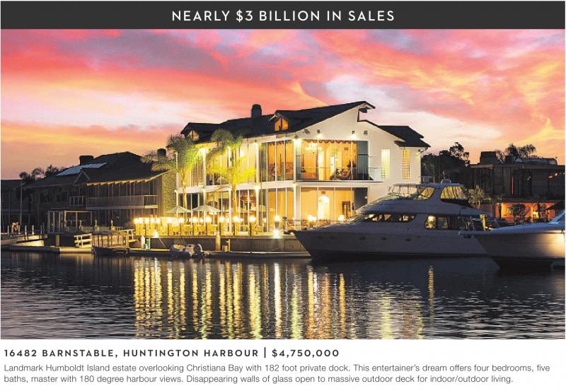 N E A R LY $ 3 B I L L I O N I N SA L E S 16482 BARNSTABLE, HUNTINGTON HARBOUR | $4,750,000 Landmark Humboldt Island estate overlooking Christiana Bay with 182 foot private dock. This entertainer’s dream offers four bedrooms, five baths, master with 180 degree harbour views. Disappearing walls of glass open to massive outdoor deck for indoor/outdoor living.