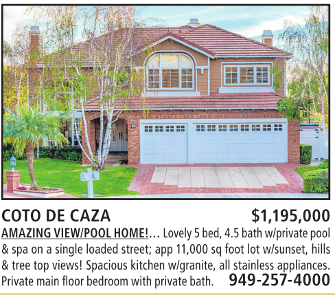 COTO DE CAZA $1,195,000 AMAZING VIEW/POOLHOME!… Lovely 5bed, 4.5bathw/private pool Find Your Next &spa on asingle loaded street; app 11,000 sq foot lot w/sunset, hills &tree top views! Spacious kitchen w/granite, all stainless appliances. Private main floorbedroom with privatebath. 949-257-4000