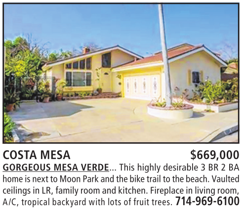 COSTA MESA $669,000 GORGEOUS MESA VERDE... This highly desirable 3BR2BA home is nexttoMoonParkand thebiketrail to thebeach. Vaulted ceilings in LR,family room and kitchen. Fireplace in living room, A/C, tropical backyard with lots of fruittrees. 714-969-6100