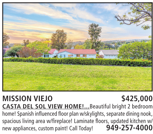 MISSION VIEJO $425,000 CASTA DEL SOL VIEW HOME!...Beautiful bright 2bedroom home!Spanishinfluencedfloorplanw/skylights,separate dining nook, spacious living area w/fireplace! Laminate floors, updated kitchen w/ new appliances, custompaint! Call Today! 949-257-4000