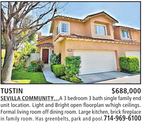TUSTIN $688,000 SEVILLA COMMUNITY…A3bedroom 3bathsingle family end Formal living room offdiningroom. Large kitchen,brick fireplace in family room.Has greenbelts, park and pool.714-969-6100 unit location. Light and Bright open floorplan w/high ceilings.
