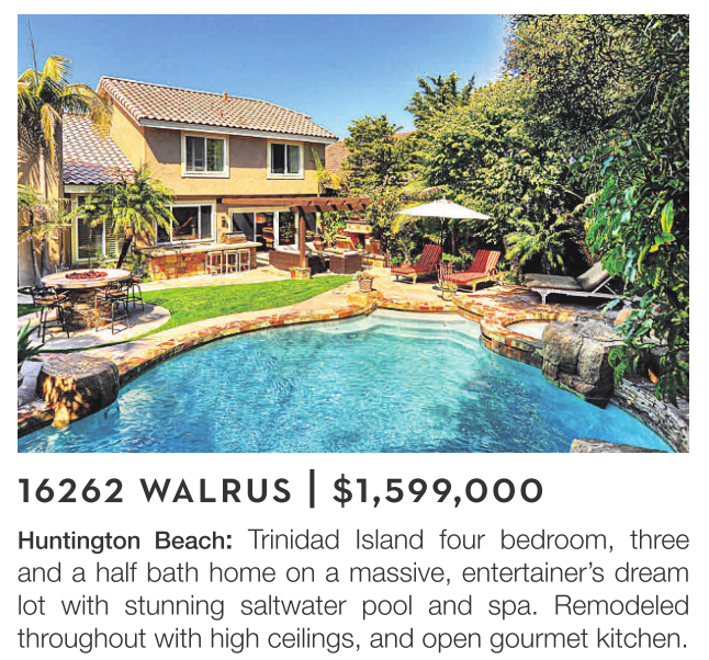 Huntington Beach: Trinidad Island four bedroom, three and a half bath home on a massive, entertainer’s dream lot with stunning saltwater pool and spa. Remodeled throughout with high ceilings, and open gourmet kitchen.