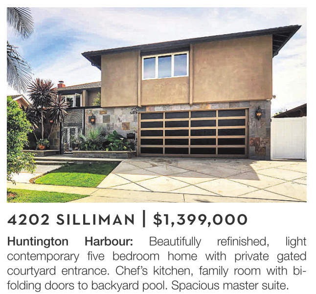 Huntington Harbour: Beautifully refinished, light contemporary five bedroom home with private gated courtyard entrance. Chef’s kitchen, family room with bifolding doors to backyard pool. Spacious master suite.