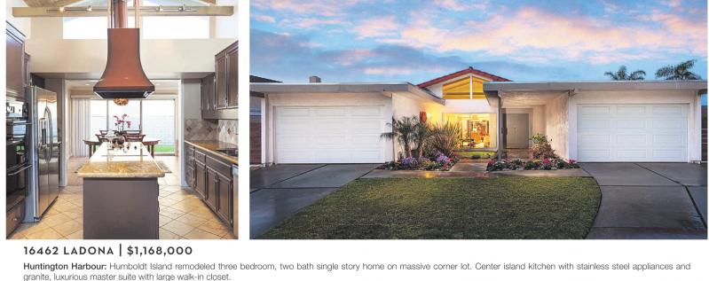16462 LADONA | $1,168,000 Huntington Harbour: Humboldt Island remodeled three bedroom, two bath single story home on massive corner lot. Center island kitchen with stainless steel appliances and granite, luxurious master suite with large walk-in closet.