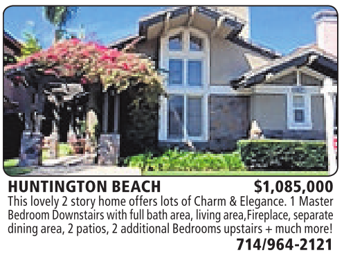 HUNTINGTON BEACH $1,085,000 This lovely 2story homeofferslotsofCharm &Elegance.1Master BedroomDownstairswithfullbatharea, living area,Fireplace,separate dining area,2patios,2additional Bedrooms upstairs +much more!