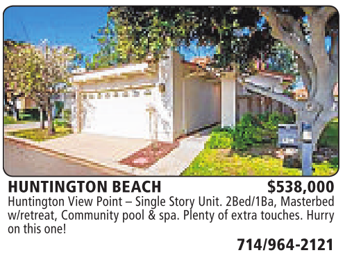 HUNTINGTON BEACH $538,000 Huntington View Point –Single Story Unit. 2Bed/1Ba, Masterbed w/retreat, Community pool &spa. Plenty ofextra touches. Hurry on this one!