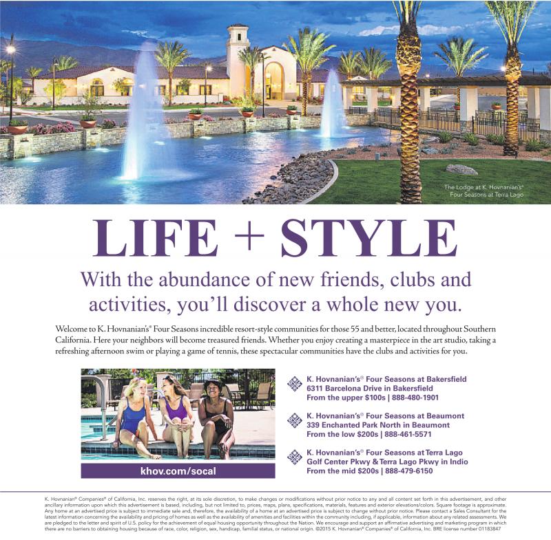 The Lodge at K. Hovnanian’s® Four Seasons at Terra Lago LIFE + STYLE With the abundance of new friends, clubs and activities, you’ll discover a whole new you. WelcometoK.Hovnanian’s®FourSeasons incredible resort-style communities forthose 55 and better, locatedthroughoutSouthern California.Here your neighbors will become treasured friends. Whether you enjoy creating a masterpiece in the art studio,taking a refreshing afternoon swim or playing a game of tennis, these spectacular communities have the clubs and activities for you. K. Hovnanian’s ® Four Seasons at Bakersfield 6311 Barcelona Drive in Bakersfield From the upper $100s | 888-480-1901 K. Hovnanian’s ® Four Seasons at Beaumont 339 Enchanted Park North in Beaumont From the low $200s | 888-461-5571 khov.com/socal K. Hovnanian’s ® Four Seasons at Terra Lago Golf Center Pkwy &Terra Lago Pkwy in Indio From the mid $200s | 888-479-6150 K. Hovnanian ® Companies ® ® Companies ®