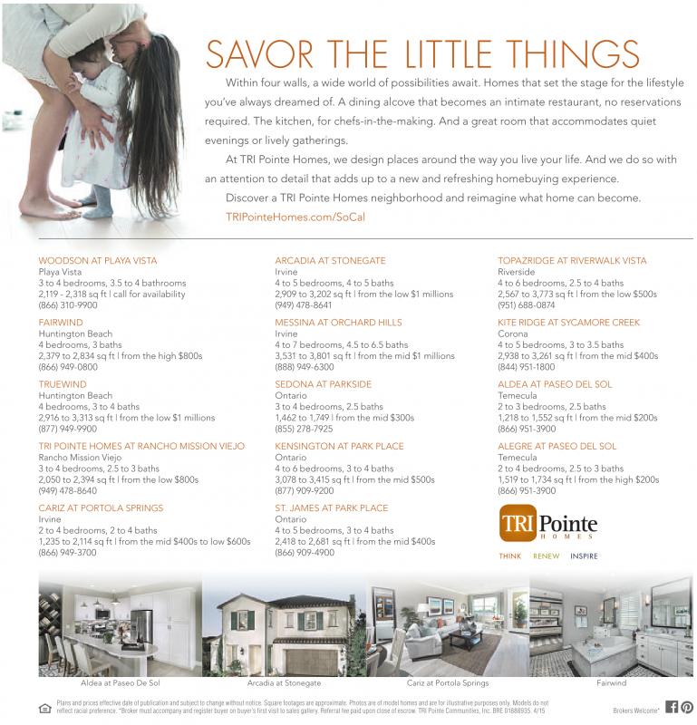 Plansand prices effectivedate of publicationand subject to change withoutnotice. Square footages areapproximate. Photos areofmodel homesand arefor illustrativepurposesonly. Modelsdonot reflect racialpreference. *Brokermustaccompanyand register buyer on buyer’sfirst visittosalesgallery. Referral feepaiduponclose of escrow.TRI Pointe Communities,Inc. BRE 01888935. 4/15
