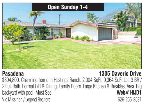 Pasadena Open Sunday 1-4 1305 Daveric Drive Vic Missirian /Legend Realtors 626-255-2537 $894,800.Charming home in Hastings Ranch. 2,004 SqFt.9,364 SqFt Lot. 3BR/ 2FullBath.FormalL/R &Dining. FamilyRoom.Large Kitchen&Breakfast Area. Big backyardwithpool. Must See!!! Web# HIJD1