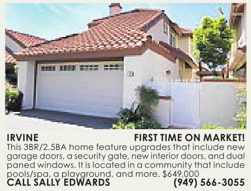 IRVINE FIRST TIME ONMARKET! This 3BR/2.5BA home feature upgrades that include new garage doors,asecuritygate, newinterior doors,and dual panedwindows.Itislocated in acommunity that include pools/spa, aplayground, and more. $649,000 CALL SALLY EDWARDS (949) 566-3055