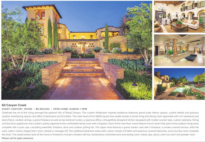 63 Canyon Creek SHADY CANYON®, IRVINE | $6,950,000 | OPEN HOME: SUNDAY 1-4PM Celebrate the art of fine living amongst the pastoral hills of Shady Canyon. This custom Andalusian inspired residence balances grand scale interior spaces, custom details and gracious outdoor entertaining spaces and offers 5 bedrooms and 6.5 baths. The main level of this 9,600 square foot estate boasts a formal living and dining room appointed with rich hardwood and stone floors, vaulted ceilings, a grand fireplace as well as two bedroom suites, a spacious office, a thoughtfully designed kitchen equipped with marble counter tops, custom cabinetry, Viking and Sub-Zero appliances and abutler’spantry adjoined to the comfortable familyroomwithafireplace.Each of the main floor rooms feature French doors that open to the outdoor living areas complete with a pool, spa, cascading waterfalls, fireplace, deck and outdoor grilling bar. The upper level features a grand master suite with a fireplace, a private covered terrace, artful tile work, walk-in closet, elegant bat h and a retreat or massage loft. Two additional bedroom suites with custom closets, full baths and spacious covered balconies, and a laundry room complete this level. The subterranean level of the home is finished to include a theatre with bar, temperature controlled wine and tasting room, indoor spa, sauna, work out room and powder room. Please call for gate clearance.