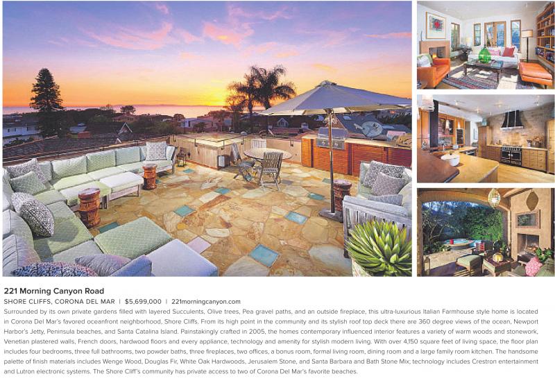 SHORE CLIFFS, CORONA DEL MAR | $5,699,000 | 221morningcanyon.com Surrounded by its own private gardens filled with layered Succulents, Olive trees, Pea gravel paths, and an outside fireplace, this ultra-luxurious Italian Farmhouse style home is located in Corona Del Mar’s favored oceanfront neighborhood, Shore Cliffs. From its high point in the community and its stylish roof top deck there are 360 degree views of the ocean, Newport Harbor’s Jetty, Peninsula beaches, and Santa Catalina Island. Painstakingly crafted in 2005, the homes contemporary influenced interior features a variety of warm woods and stonework, Venetian plastered walls, French doors, hardwood floors and every appliance, technology and amenity for stylish modern living. With over 4,150 square feet of living space, the floor plan includes four bedrooms, three full bathrooms, two powder baths, three fireplaces, two offices, a bonus room, formal living room, dining room and a large family room kitchen. The handsome palette of finish materials includes Wenge Wood, Douglas Fir, White Oak Hardwoods, Jerusalem Stone, and Santa Barbara and Bath Stone Mix; technology includes Crestron entertainment and Lutron electronic systems. The Shore Cliff’s community has private access to two of Corona Del Mar’s favorite beaches.