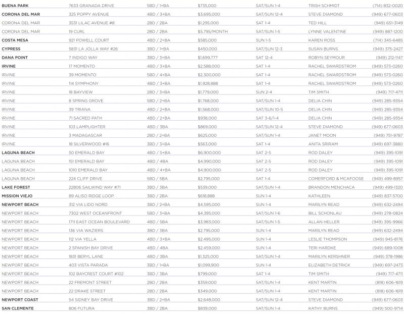 IRVINE 17 MOMENTO 4BD / 3+BA $2,588,000 SAT 1-4 RACHEL SWARDSTROM (949) 573-0260 IRVINE 39 MOMENTO 5BD / 4+BA $2,300,000 SAT 1-4 RACHEL SWARDSTROM (949) 573-0260 IRVINE 114 SYMPHONY 4BD / 3+BA $1,928,888 SAT 1-4 RACHEL SWARDSTROM (949) 573-0260 IRVINE 18 BAYVIEW 2BD / 3+BA $1,779,000 SUN 2-4 TIM SMITH (949) 717-4711 IRVINE 8 SPRING GROVE 5BD / 2+BA $1,768,000 SAT/SUN 1-4 DELIA CHIN (949) 285-9354 IRVINE 39 TRIANA 4BD / 2+BA $1,568,000 SAT/SUN 10-5 DELIA CHIN (949) 285-9354 IRVINE 71 SACRED PATH 4BD / 2+BA $938,000 SAT 3-6/1-4 DELIA CHIN (949) 285-9354 IRVINE 103 LAMPLIGHTER 4BD / 3BA $869,000 SAT/SUN 12-4 STEVE DIAMOND (949) 677-0603 IRVINE 3 MADAGASCAR 2BD / 2+BA $625,000 SAT/SUN 1-4 JANET MOON (949) 751-9787 IRVINE 18 SILVERWOOD #16 3BD / 3+BA $563,000 SAT 1-4 ANITA SRIRAM (949) 697-3880 LAGUNA BEACH 50 EMERALD BAY 4BD / 5+BA $6,900,000 SAT 2-5 ROD DALEY (949) 395-1091 LAGUNA BEACH 151 EMERALD BAY 4BD / 4BA $4,990,000 SAT 2-5 ROD DALEY (949) 395-1091 LAGUNA BEACH 1010 EMERALD BAY 4BD / 4+BA $4,900,000 SAT 2-5 ROD DALEY (949) 395-1091 LAGUNA BEACH 224 CLIFF DRIVE 5BD / 5BA $2,795,000 SAT 1-4 COMERFORD & MCAFOOSE (949) 499-8957 LAKE FOREST 22806 SAILWIND WAY #71 3BD / 3BA $539,000 SAT/SUN 1-4 BRANDON MENCHACA (949) 499-1320 MISSION VIEJO 89 ALISO RIDGE LOOP 3BD / 2BA $618,888 SUN 1-4 KATHLEEN (949) 837-5700 NEWPORT BEACH 312 VIA LIDO NORD 3BD / 2+BA $4,595,000 SUN 1-4 MARILYN READ (949) 632-2494 NEWPORT BEACH 7302 WEST OCEANFRONT 5BD / 3+BA $4,395,000 SAT/SUN 1-6 BILL SCHONLAU (949) 278-0824 NEWPORT BEACH 1711 EAST OCEAN BOULEVARD 4BD / 5BA $3,983,000 SAT/SUN 1-5 ALLAN HELLER (949) 395-9966 NEWPORT BEACH 136 VIA WAZIERS 3BD / 3BA $2,795,000 SUN 1-4 MARILYN READ (949) 632-2494 NEWPORT BEACH 112 VIA YELLA 4BD / 3+BA $2,495,000 SUN 1-4 LESLIE THOMPSON (949) 945-8176 NEWPORT BEACH 2 SPANISH BAY DRIVE 4BD / 4BA $2,459,000 SUN 1-4 TERI HARDKE (949) 689-1008 NEWPORT BEACH 1831 BERYL LANE 4BD / 3BA $1,325,000 SAT/SUN 1-4 MARILYN KERSHNER (949) 378-1986 NEWPORT BEACH 403 VISTA PARADA 3BD / 1+BA $1,099,900 SUN 1-4 ELIZABETH DETRICK (949) 697-2473 NEWPORT BEACH 102 BAYCREST COURT #102 3BD / 3BA $799,000 SAT 1-4 TIM SMITH (949) 717-4711 NEWPORT BEACH 22 FREMONT STREET 2BD / 2BA $359,000 SAT/SUN 1-4 KENT MARTIN (818) 606-1619 NEWPORT BEACH 22 DRAKE STREET 2BD / 2BA $349,000 SAT/SUN 1-4 KENT MARTIN (818) 606-1619 NEWPORT COAST 54 SIDNEY BAY DRIVE 3BD / 2+BA $2,648,000 SAT/SUN 12-4 STEVE DIAMOND (949) 677-0603 SAN CLEMENTE 806 FUTURA 3BD / 2BA $839,000 SAT/SUN 1-4 KATHY BURNS (949) 500-9714
