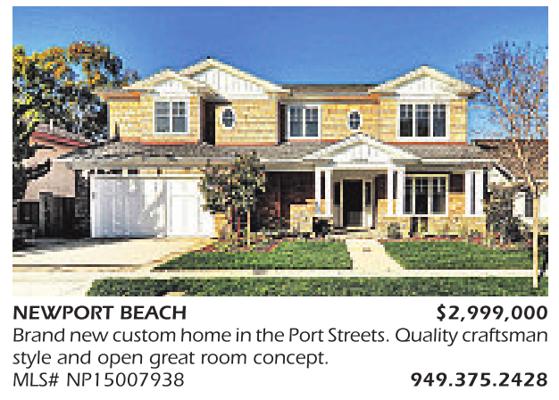 NEWPORT BEACH $2,999,000 Brand new custom home in the Port Streets. Quality craftsman style and open great room concept. MLS# NP15007938 949.375.2428