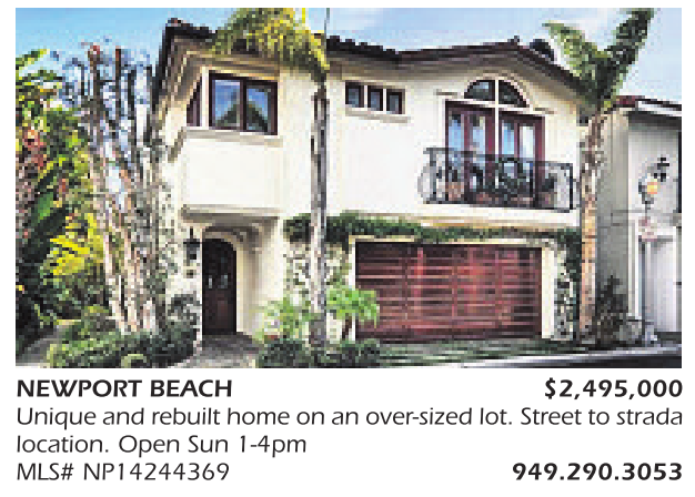 NEWPORT BEACH $2,495,000 Unique and rebuilt home on an over-sized lot. Street to strada location. Open Sun 1-4pm MLS# NP14244369 949.290.3053