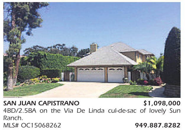 SAN JUAN CAPISTRANO $1,098,000 4BD/2.5BA on the Via De Linda cul-de-sac of lovely Sun Ranch. MLS# OC15068262 949.887.8282