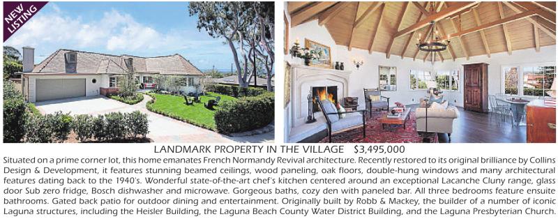 Situated on a prime corner lot, this home emanates French Normandy Revival architecture. Recently restored to its original brilliance by Collins Design & Development, it features stunning beamed ceilings, wood paneling, oak floors, double-hung windows and many architectural features dating back to the 1940's. Wonderful state-of-the-art chef's kitchen centered around an exceptional Lacanche Cluny range, glass door Sub zero fridge, Bosch dishwasher and microwave. Gorgeous baths, cozy den with paneled bar. All three bedrooms feature ensuite bathrooms. Gated back patio for outdoor dining and entertainment. Originally built by Robb & Mackey, the builder of a number of iconic Laguna structures, including the Heisler Building, the Laguna Beach County Water District Building, and the Laguna Presbyterian Church.