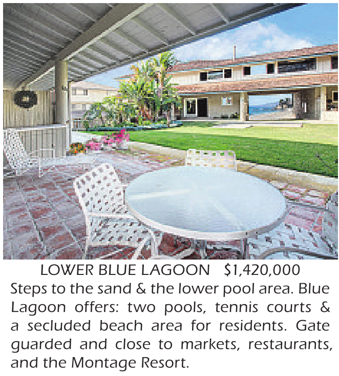 LOWER BLUE LAGOON $1,420,000 Steps to the sand & the lower pool area. Blue Lagoon offers: two pools, tennis courts & a secluded beach area for residents. Gate guarded and close to markets, restaurants, and the Montage Resort.