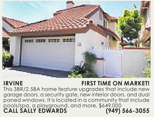 IRVINE FIRST TIME ONMARKET! This 3BR/2.5BA home feature upgrades that include new garage doors,asecuritygate, newinterior doors,and dual panedwindows.Itislocated in acommunity that include pools/spa, aplayground, and more. $649,000 CALL SALLY EDWARDS (949) 566-3055