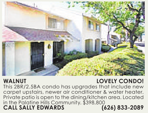 WALNUT LOVELY CONDO! This 2BR/2.5BA condo has upgrades that include new carpet upstairs, newer air conditioner &water heater. Privatepatio is open to thedining/kitchenarea. Located in the Palatine Hills Community. $398,800 CALL SALLY EDWARDS (626) 833-2089