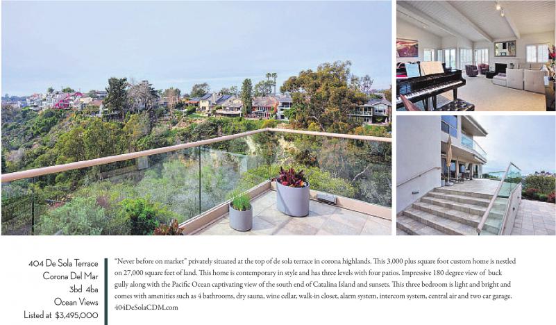 404 De Sola Terrace Corona Del Mar 3bd 4ba Ocean Views Listed at $3,495,000 “Never beforeonmarket” privately situatedatthe topofdesolaterrace in coronahighlands.This 3,000 plus squarefootcustom home is nestled on 27,000 squarefeetofland. Thishomeiscontemporaryinstyle and hasthree levels withfourpatios.Impressive180 degree view of buck gullyalongwiththe PacificOcean captivating view of thesouth endofCatalina Island andsunsets. Thisthree bedroomislight and bright and comeswithamenities such as 4bathrooms,dry sauna, wine cellar,walk-in closet, alarmsystem, intercom system, centralair and twocar garage. 404DeSolaCDM.com