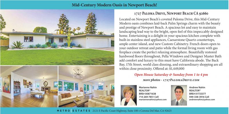 Located on Newport Beach’s coveted Paloma Drive, this Mid-Century Modern oasis combines laid-back Palm Springs charm with the beauty and prestige of Newport Beach. A spacious lot and easy to maintain landscaping lead way to the bright, open feel of this impeccably designed home. Entertaining is a delight in your spacious kitchen complete with built-in stainless steel appliances, Caesarstone Quartz countertops, ample center island, and new Custom Cabinetry. French doors open to your outdoor retreat and patio while the formal living room with gas fireplace create the perfect relaxing atmosphere. Beautifully restored hardwood floors throughout, Pella Windows and Designer Master Bath add comfort and luxury to this must have California abode. The Back Bay, 17th Street, world class dinning, and extraordinary shopping are all within close proximity. Offered at: $1,449,000