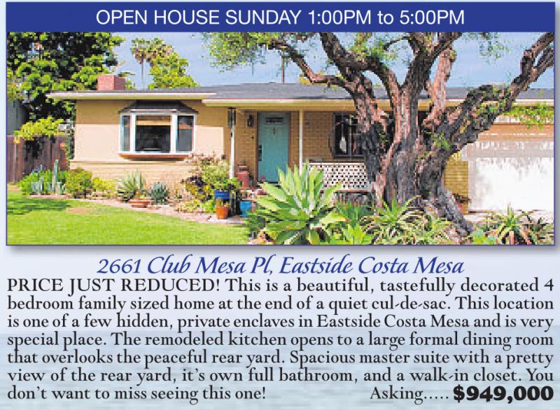 OPEN HOUSE SUNDAY 1:00PM to 5:00PM 2661 Club Mesa Pl, Eastside Costa Mesa PRICE JUST REDUCED! This is a beautiful, tastefully decorated 4 bedroom family sized home at the end of a quiet cul-de-sac.This location is one of a few hidden, private enclaves in Eastside Costa Mesa and is very special place.The remodeled kitchen opens to a large formal dining room that overlooks the peaceful rear yard. Spacious master suite with a pretty view of the rear yard, it’s own full bathroom, and a walk-in closet.You don’t want to miss seeing this one! Asking..... $949,000 2015 EASTSIDE COSTA MESA