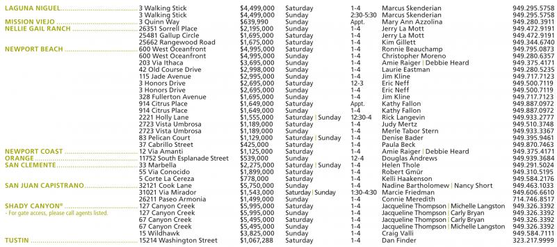 LAGUNA NIGUEL....................................... 3 Walking Stick $4,499,000 Saturday 1-4 Marcus Skenderian 949.295.5758 3 Walking Stick $4,499,000 Sunday 2:30-5:30 Marcus Skenderian 949.295.5758 MISSION VIEJO ......................................... 3 Quinn Way $639,990 Sunday Appt. Mary Ann Azzolina 949.280.3911 NELLIE GAIL RANCH ................................. 26351 Sorrell Place $2,195,000 Sunday 1-4 Jerry La Mott 949.472.9191 25481 Gallup Circle $1,695,000 Saturday 1-4 Jerry La Mott 949.472.9191 25662 Rangewood Road $1,675,000 Saturday 1-4 Kim Gillett 949.344.6740 NEWPORT BEACH ..................................... 600 West Oceanfront $4,995,000 Saturday 1-4 Ronnie Beauchamp 949.795.0873 600 West Oceanfront $4,995,000 Sunday 1-4 Christopher Moreno 949.280.6357 203 Via Ithaca $3,695,000 Sunday 1-4 Amie Raiger | Debbie Heard 949.375.4171 42 Old Course Drive $2,998,000 Sunday 1-4 Laurie Eastman 949.280.5235 115 Jade Avenue $2,995,000 Sunday 1-4 Jim Kline 949.717.7123 3 Honors Drive $2,695,000 Saturday 12-3 Eric Neff 949.500.7119 3 Honors Drive $2,695,000 Sunday 1-4 Eric Neff 949.500.7119 328 Fullerton Avenue $1,695,000 Sunday 1-4 Jim Kline 949.717.7123 914 Citrus Place $1,649,000 Saturday Appt. Kathy Fallon 949.887.0972 914 Citrus Place $1,649,000 Sunday 1-4 Kathy Fallon 949.887.0972 2221 Holly Lane $1,555,000 Saturday | Sunday 12:30-4 Rick Langevin 949.933.2777 2723 Vista Umbrosa $1,189,000 Saturday 1-4 Judy Mertz 949.510.3748 2723 Vista Umbrosa $1,189,000 Sunday 1-4 Merle Tabor Stern 949.933.3367 83 Pelican Court $1,129,000 Saturday | Sunday 1-4 Denise Bader 949.395.9461 37 Cabrillo Street $425,000 Saturday 1-4 Paula Beck 949.870.7463 NEWPORT COAST ..................................... 12 Via Amanti $1,125,000 Saturday 1-4 Amie Raiger | Debbie Heard 949.375.4171 ORANGE.................................................... 11752 South Esplanade Street $539,000 Sunday 12-4 Douglas Andrews 949.939.3684 SAN CLEMENTE......................................... 33 Marbella $2,275,000 Saturday | Sunday 1-4 Helen Thole 949.291.5024 55 Via Conocido $1,899,000 Saturday 1-4 Robert Gmür 949.310.5195 5 Corte La Cereza $778,000 Saturday 1-4 Kelli Haakenson 949.584.2176 SAN JUAN CAPISTRANO........................... 32121 Cook Lane $5,750,000 Sunday 1-4 Nadine Bartholomew | Nancy Short 949.463.1033 31021 Via Mirador $1,543,000 Saturday | Sunday 1:30-4:30 Marcie Friedman 949.606.6610 26211 Paseo Armonia $1,499,000 Sunday 1-4 Connie Meredith 714.746.8517 SHADY CANYON ® ..................................... 127 Canyon Creek $5,995,000 Saturday 1-4 JacquelineThompson | MichelleLangston 949.326.3392 - Forgateaccess, pleasecallagentslisted. 127 Canyon Creek $5,995,000 Sunday 1-4 Jacqueline Thompson | CarlyBryan 949.326.3392 67 Canyon Creek $5,495,000 Saturday 1-4 JacquelineThompson | CarlyBryan 949.326.3392 67 Canyon Creek $5,495,000 Sunday 1-4 Jacqueline Thompson | MichelleLangston 949.326.3392 15 Wildhawk $3,825,000 Sunday 1-4 Craig Valli 949.584.7111 TUSTIN ...................................................... 15214 Washington Street $1,067,288 Saturday 1-4 Dan Finder 323.217.9999